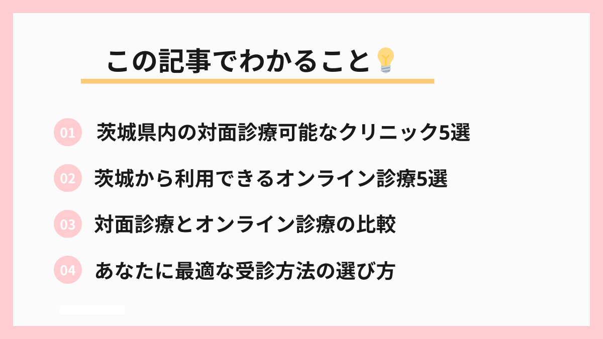 茨城県には水戸市、つくば市、日立市などの主要都市に産婦人科クリニックがあり、また全国から利用できるオンライン診療サービスも充実しています。
