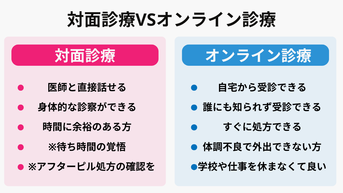 福島県でアフターピルの処方を受ける方法は、対面診療とオンライン診療の2つがあります。それぞれにメリット・デメリットがあるため、あなたの状況に応じて選択することが重要です。