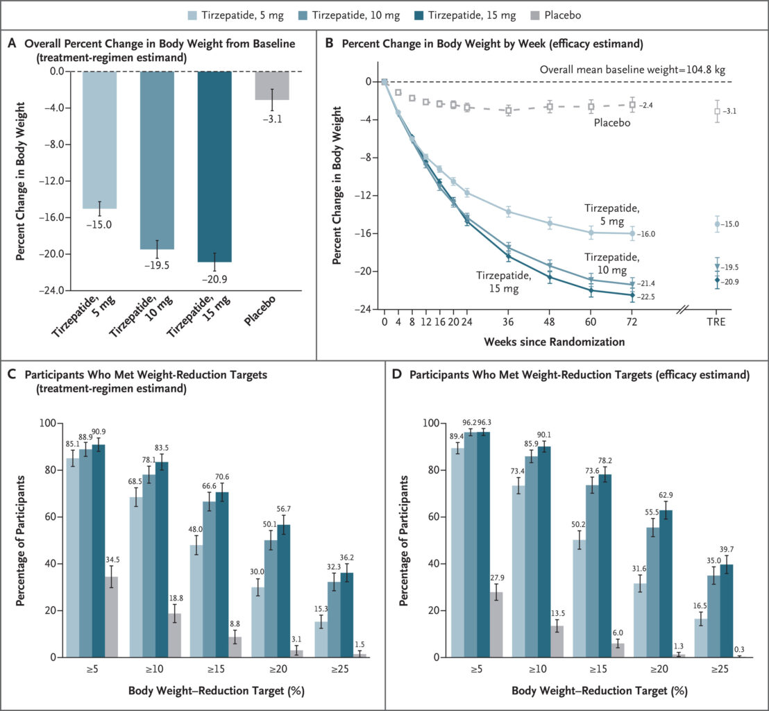 世界的な臨床試験プログラム「SURPASS試験」の結果を詳しく見ると、プラセボ(偽薬)や従来のGLP-1製剤と比較して圧倒的な体重減少の優位性が示されているのは、一貫して5mg以上の用量からです。