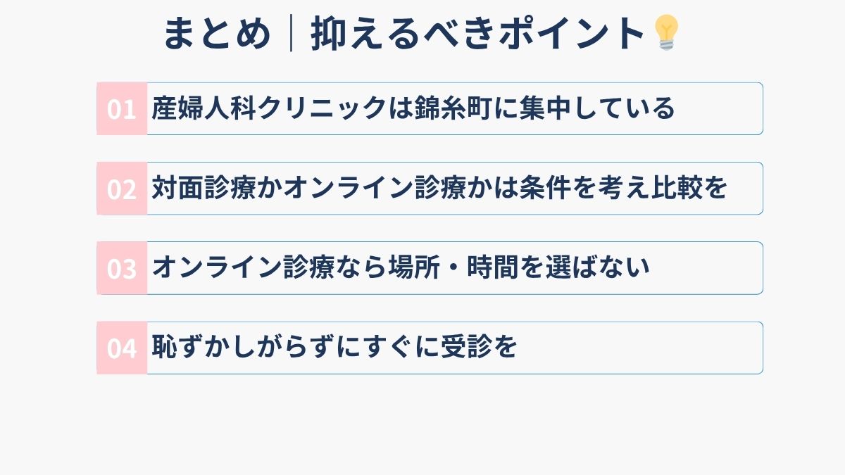 墨田区内では、利便性からオンライン診療を選ぶ方が増えています。初めての服用で不安が大きい場合は、対面診療の安心感も捨てがたいでしょう。あなたの価値観と状況に最も適した選択をすることが大切です。