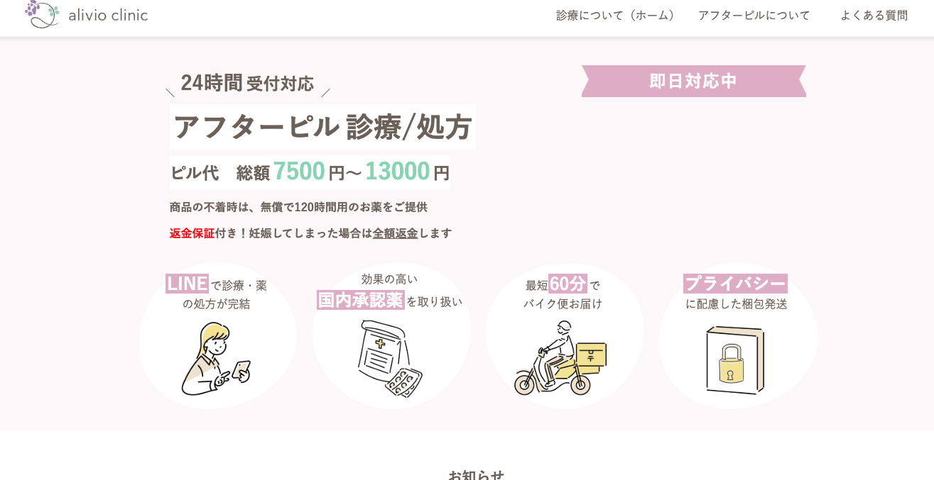 なるべく人に会わずにアフターピルを受け取りたい方には、オンラインクリニックがおすすめです。