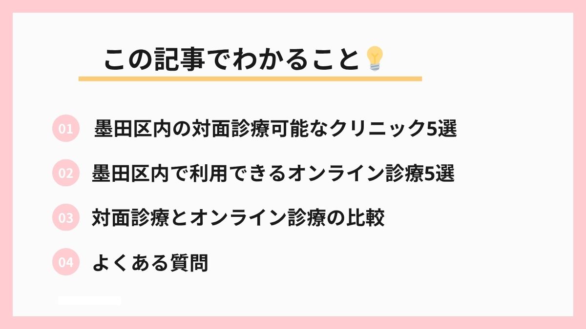 この記事では、墨田区内で信頼できる対面診療クリニック5選と、24時間対応可能なオンラインクリニック5選を厳選してご紹介します。