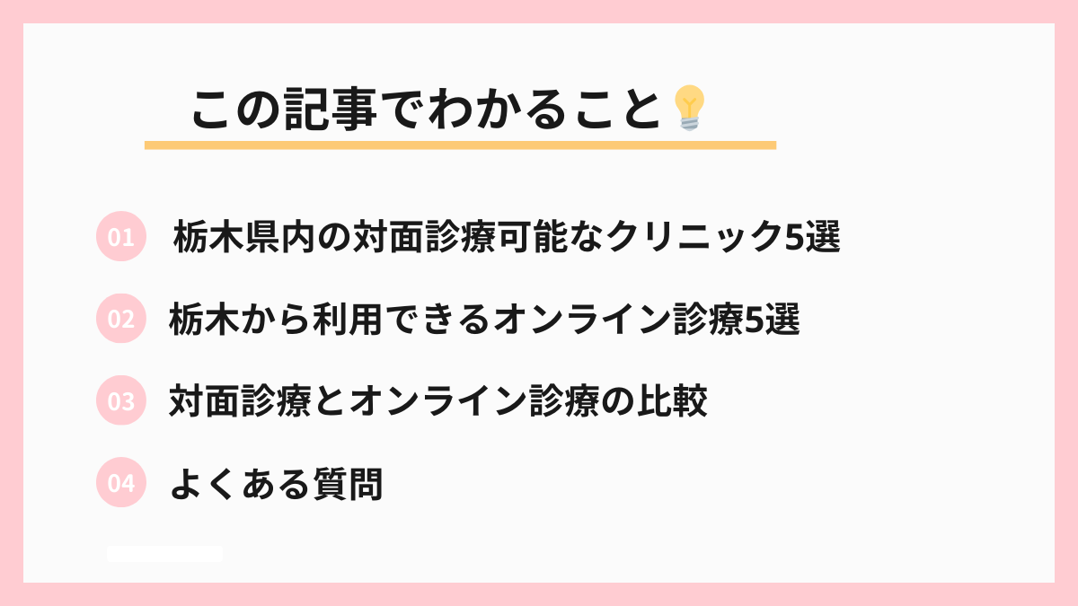 実際に医師と対面で相談したい方にとって、栃木県内の選択肢は宇都宮市に集中しているのが現状です。