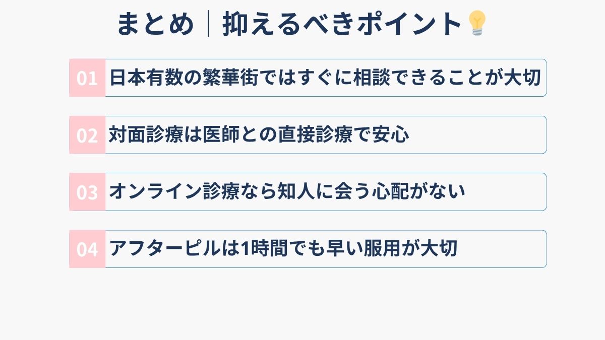 緊急避妊が必要になった時、一人で悩まず、早めに医療機関に相談することが何より大切です。