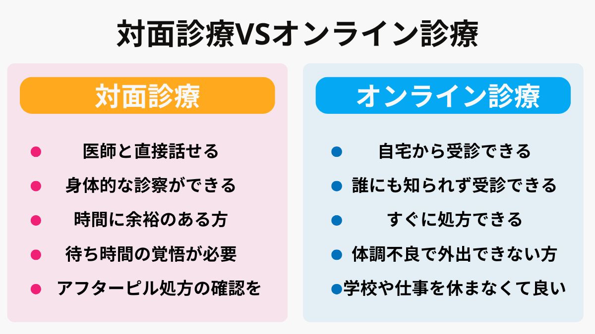オンライン診療の場合、女性医師を確実に選べます。チャットやLINEで気軽に相談できます。服用後もフォローアップを受けられます。