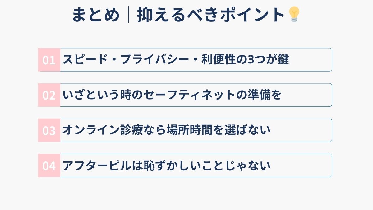 ここまでご紹介してきた通り、アフターピルの入手方法には、「オンラインクリニック」と「地域のクリニック・病院」の2つの選択肢があります。どちらを選ぶべきかはご自身の状況や優先事項によって異なります。