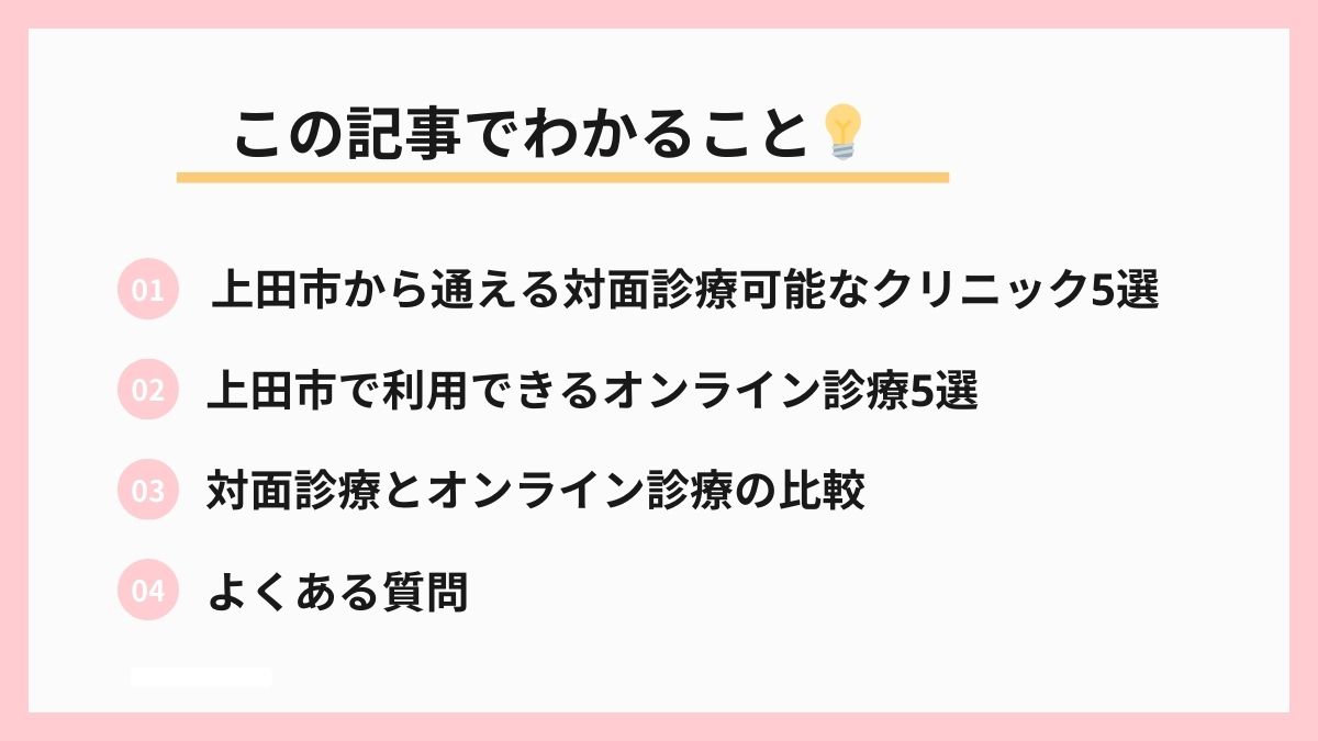この記事では、上田市周辺で対面診療が受けられるクリニック5院と、24時間対応のオンラインクリニック5院を厳選してご紹介します。