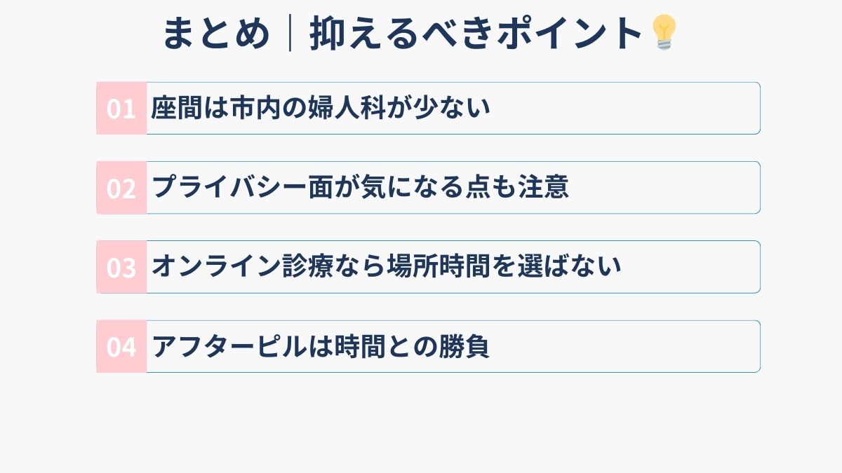 座間市でアフターピル処方を検討する際の重要ポイントは、以下の5つのポイントです。