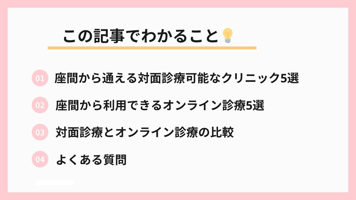 この記事では、座間市内で信頼できる対面診療クリニック5選と、24時間365日対応可能なオンラインクリニック5選を徹底比較します。診療時間、アクセス、料金体系、プライバシー配慮など、アフターピル処方において本当に知りたい情報を分かりやすくまとめました。さらに、対面診療とオンライン診療のメリット・デメリットを明確にし、あなたの状況に最適な選択肢を見つけるお手伝いをします。
